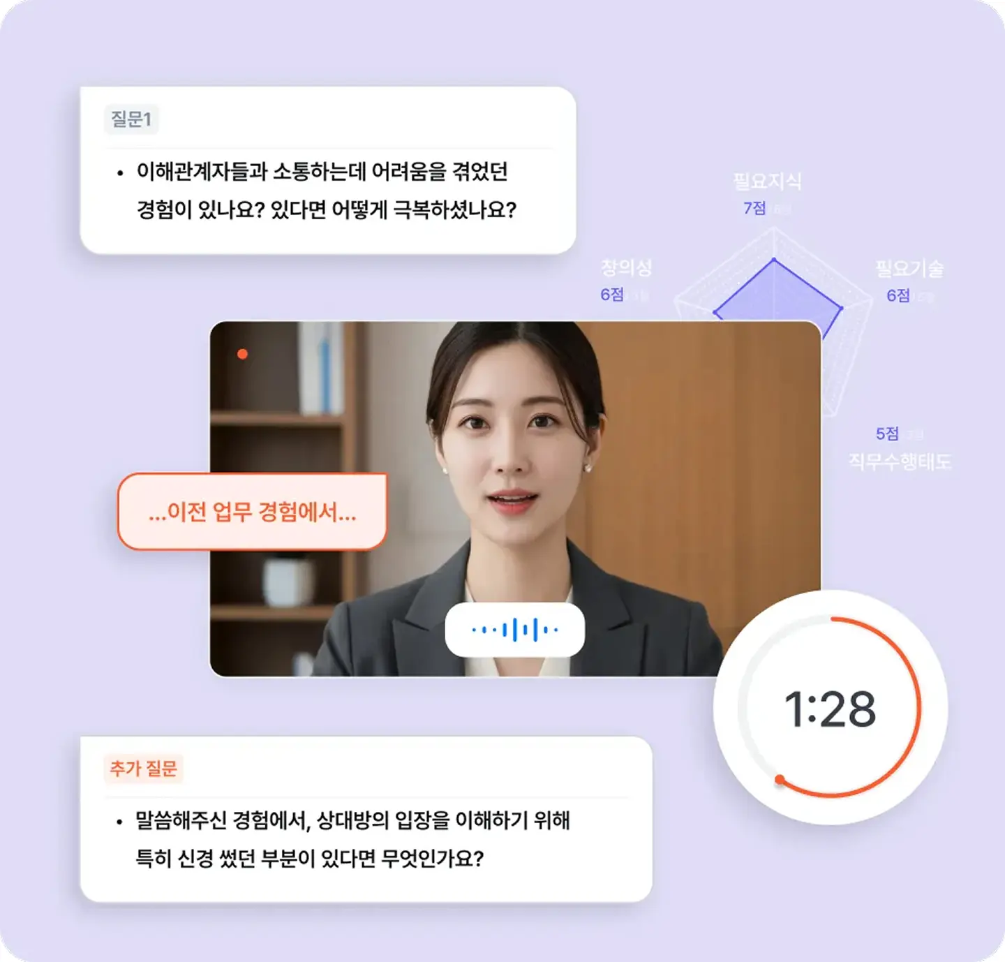 기업의 채용 직무, 평가기준, 질문유형에 맞춤화하여 AI가 면접을 대신 수행하고, 면접에 대한 평가와 의사결정은 사람이 책임감 있게 할 수 있도록 자료를 제공합니다.