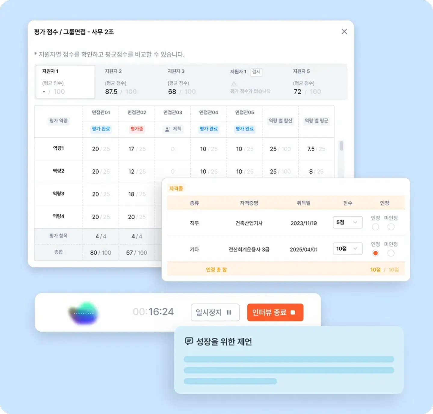 서류 및 면접전형의 기록, 평가, 채팅, 지원자 관리(결시, 제척 등) 기능을 제공하며, 평가 종료 후 실제 데이터를 기반으로 지원자 피드백 레터를 자동으로 생성합니다.
